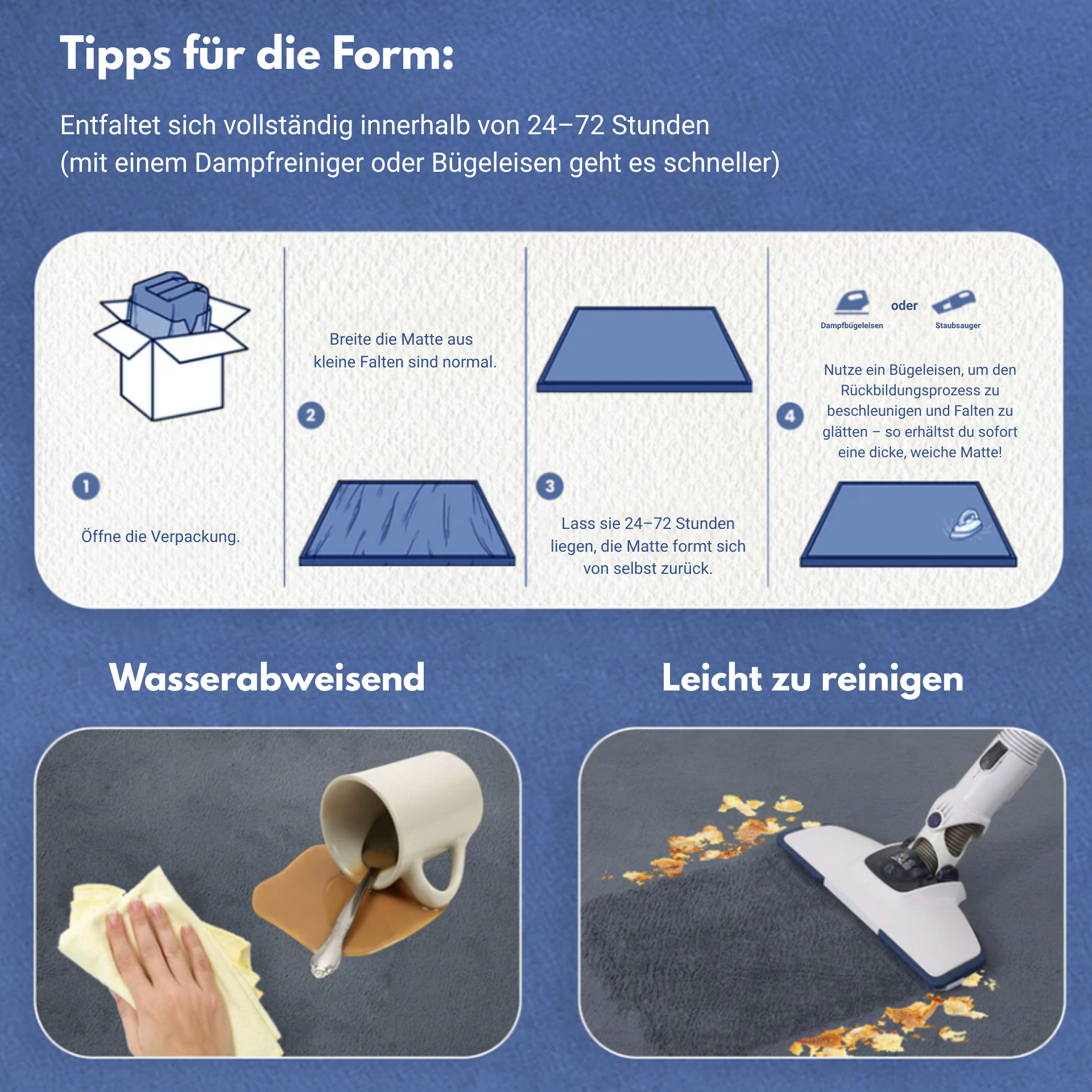 Beim Auspacken können sich Falten, Wellen oder Druckstellen zeigen – völlig normal! Am besten kurz mit einem Dampfbügeleisen vorsichtig glätten. Danach ist dein PuffPad sofort einsatzbereit.