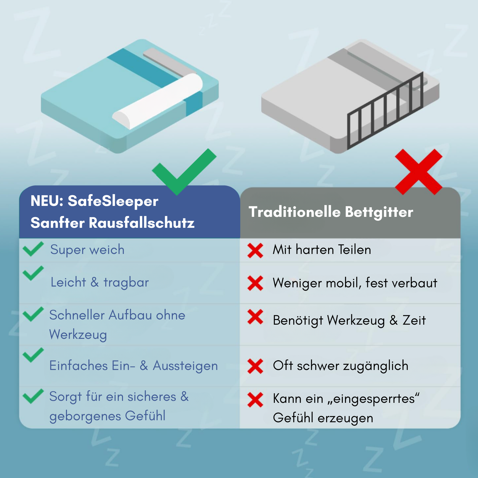 Studien zeigen, dass Kinder bis zum 5. Lebensjahr besonders häufig aus dem Bett rollen - selbst dann, wenn man denkt, sie schlafen ruhig. Traditionelle Metall- oder Holzgitter wirken zwar sicher, aber sie engen ein, sind hart und ungemütlich. Für viele Kinder entsteht dadurch eher Angst statt Geborgenheit.